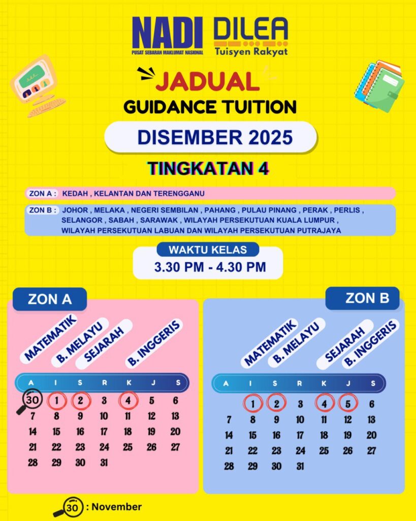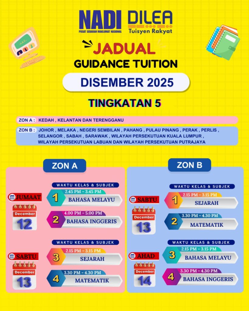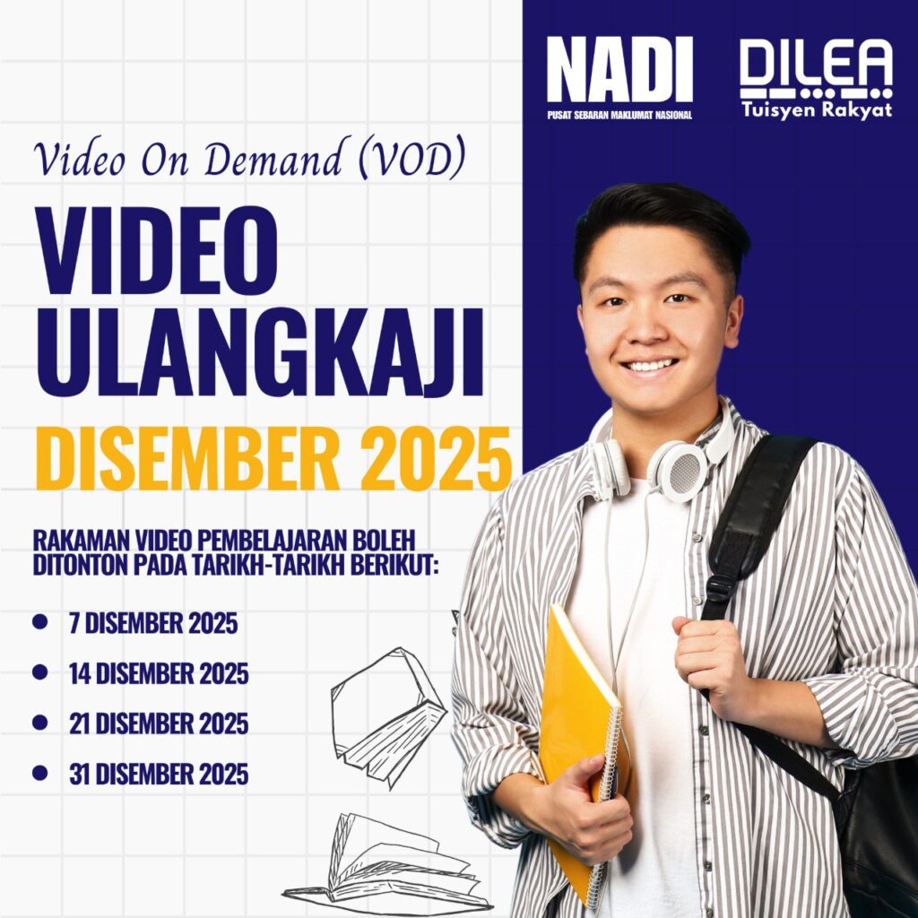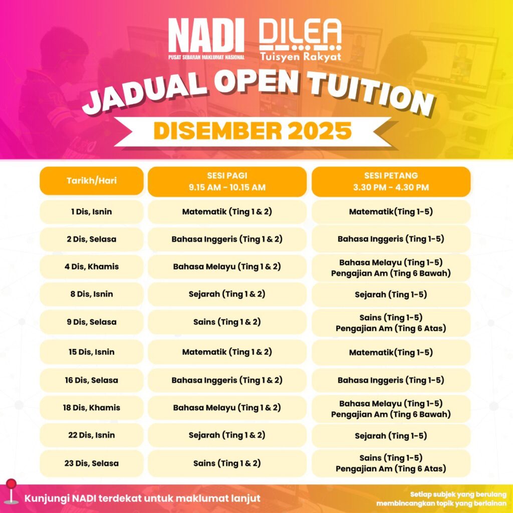 Program Tuisyen Rakyat DiLEA (Digital Learning) anjuran Pusat Sebaran Maklumat Nasional (NADI) kembali untuk bulan Disember 2025! Ini adalah peluang terbaik untuk para pelajar mengukuhkan pemahaman dalam subjek-subjek teras secara percuma.