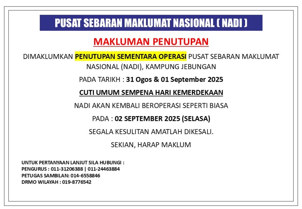 MAKLUMAN PENUTUPAN SEMENTARA OPERASI NADI SEMPENA HARI KEMERDEKAAN